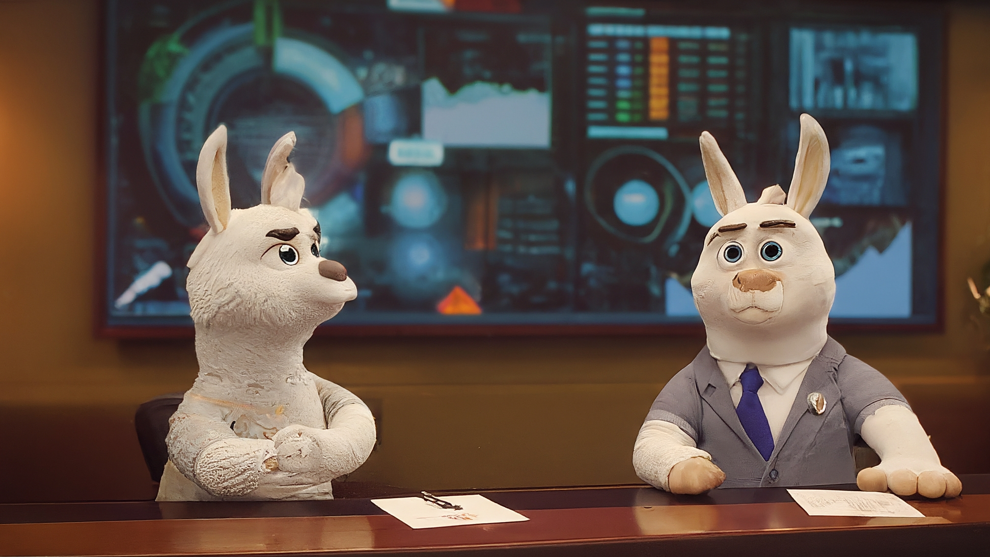 Due lama bianchi in stile cartoon, uno maschio (Marco Alam) con un completo blu elegante e un'espressione analitica ma leggermente perplessa, l'altra femmina (Kia Mala) con un vestito rosa elegante e un'espressione genuina e attenta. Stanno guardando insieme uno schermo virtuale con dati cripto completamente a zero. Sfondo neutro sui toni del blu e del rosa, che richiamano i loro abiti. Nessun testo sullo schermo.
